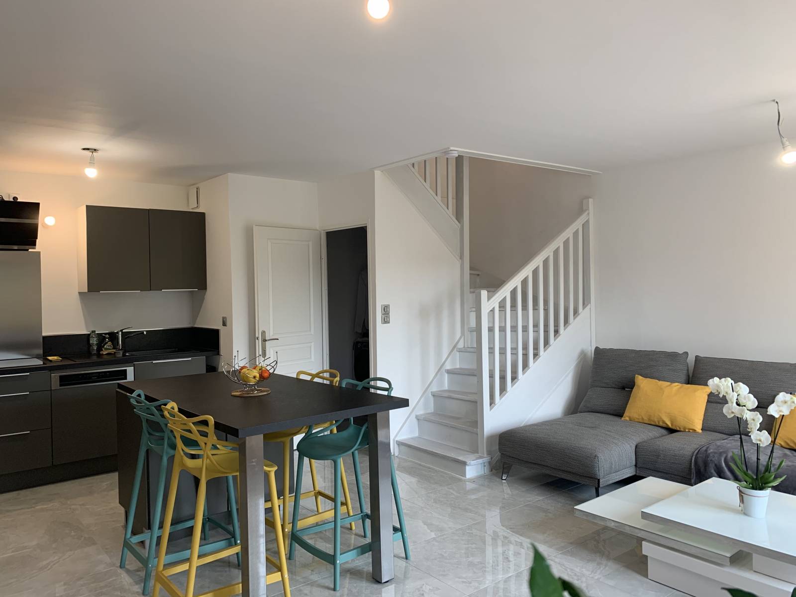 Au second niveau, nous arrivons dans la pièce de vie lumineuse où nous retrouvons une belle cuisine.
