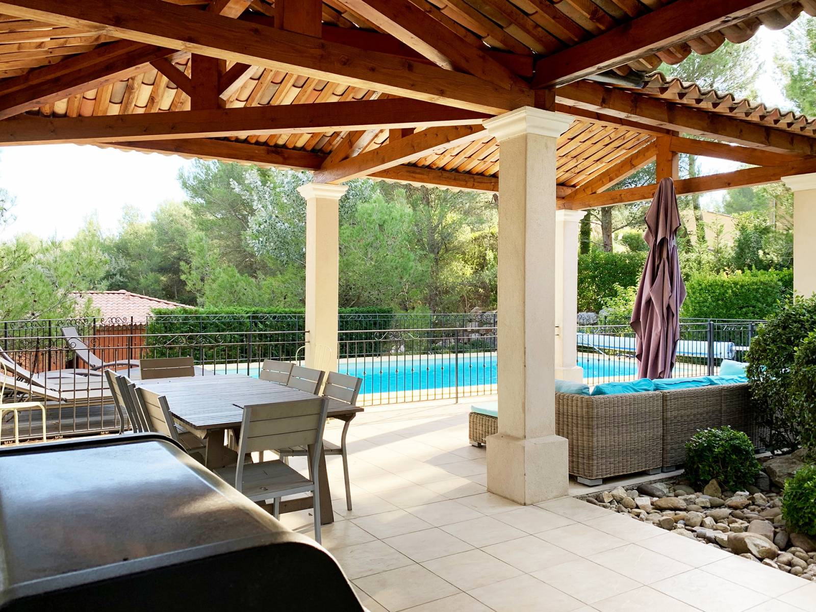 La cuisine se prolonge par une vaste terrasse qui offre des espaces à la fois ombragée et ensoleillée.