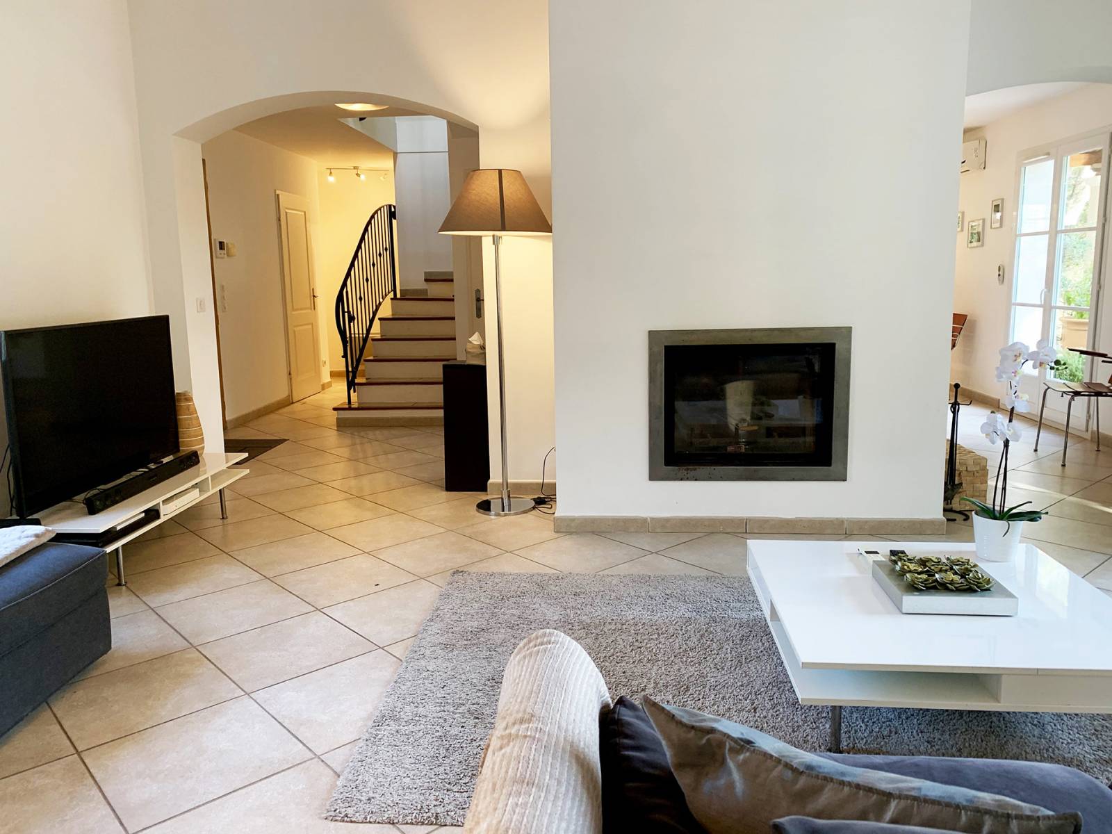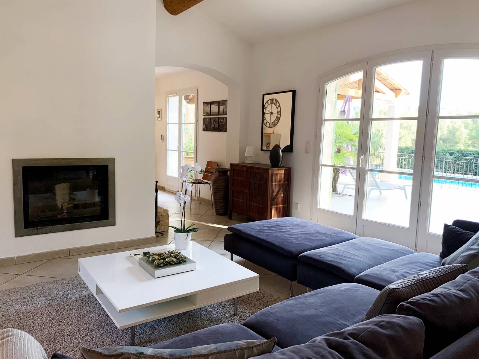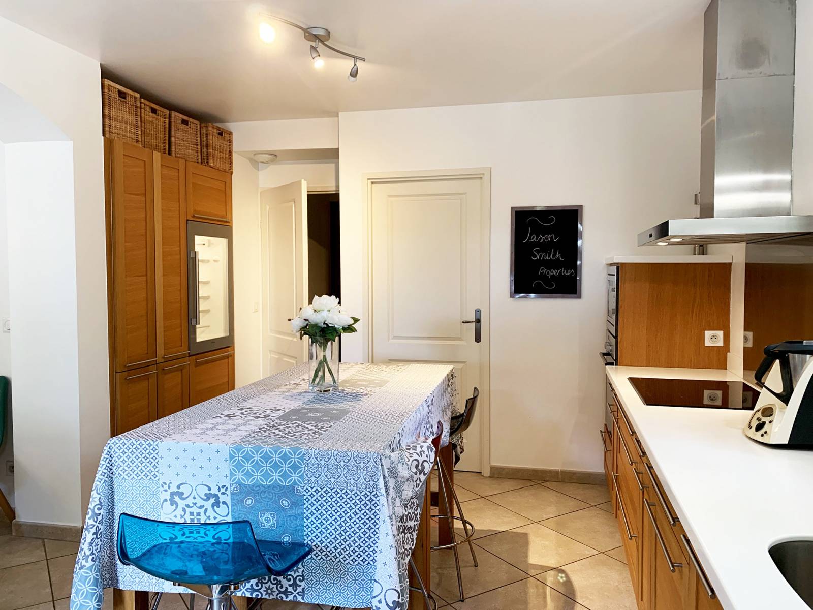 De la cuisine votre regard sera attiré par le bleu turquoise de la piscine et la ligne d’horizon, sur un grand jardin plat joliment paysagé par un mélange d’essences Provençales, adaptées au climat Méditerranéen.